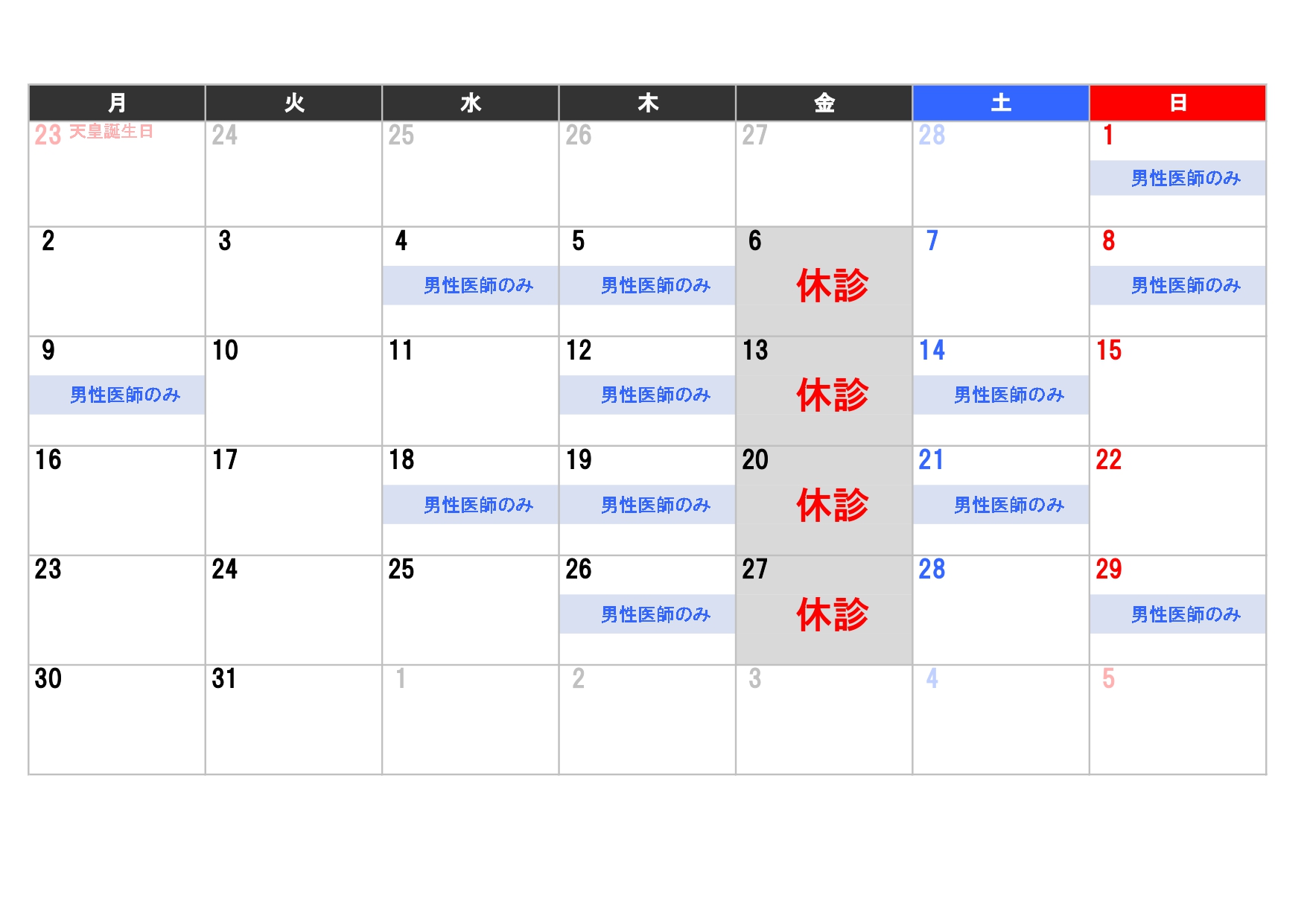 上記のお日にちは女性医師不在の為、男性医師のみでのご案内となります。