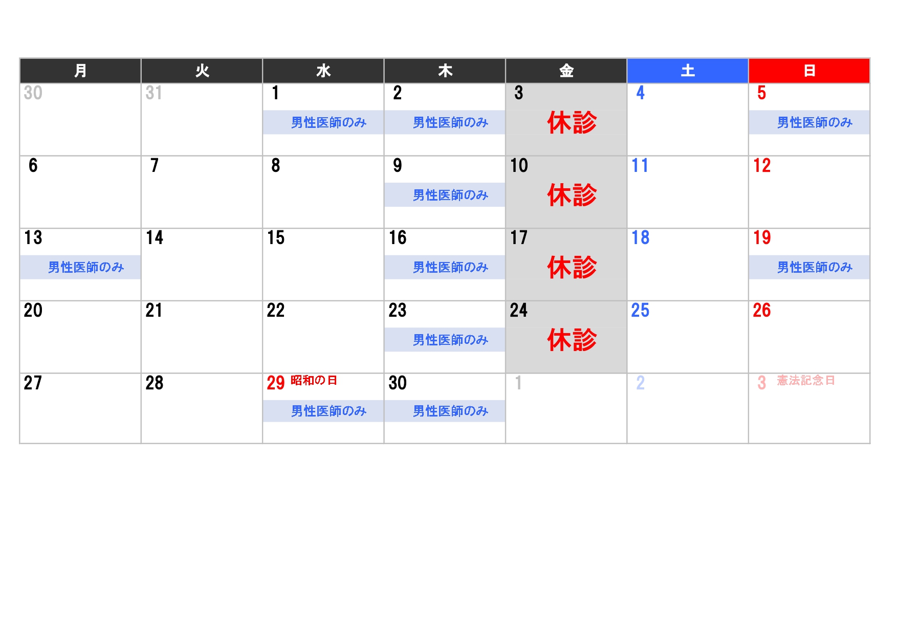 上記のお日にちは女性医師不在の為男性医師のみでのご案内となります。